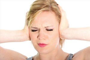 Woman suffering from a headache grimacing and holding her hands to her ears to relieve the throbbing, closeup studio head portrait on white